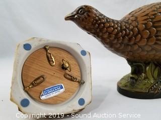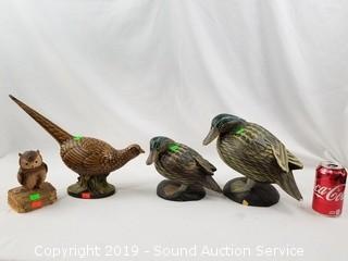 Item Description: Includes 2 hand painted wooden duck sculptures, looks like one has been repaired, beak has some damage, Gorham ceramic musical owl and Haeger ceramic pheasant. 5.5" to 11" tall, 7" to 15" long.