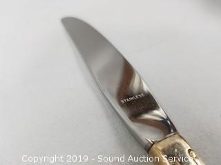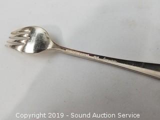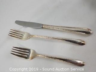 Item Description: Exquisite pattern. Includes 8 knives, 9 dinner forks, 8 salad forks, 16 table spoons, 7 soup spoons, tea spoon and serving spoon.