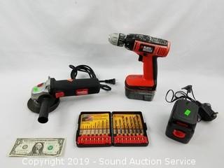 Item Description: Drill is Black & Decker, comes with charger and spare battery. Drill bits are Craftsman.