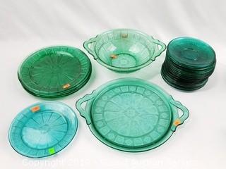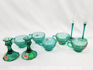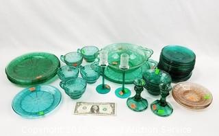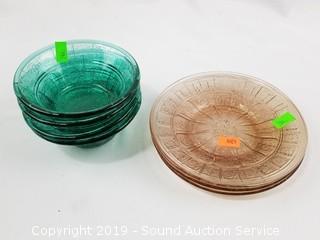 Item Description: Plates, bowls, candle holders. 3 are purple/pink tint. Floral embossed.