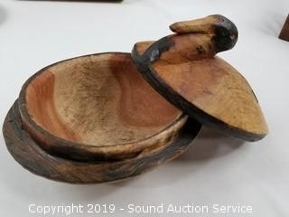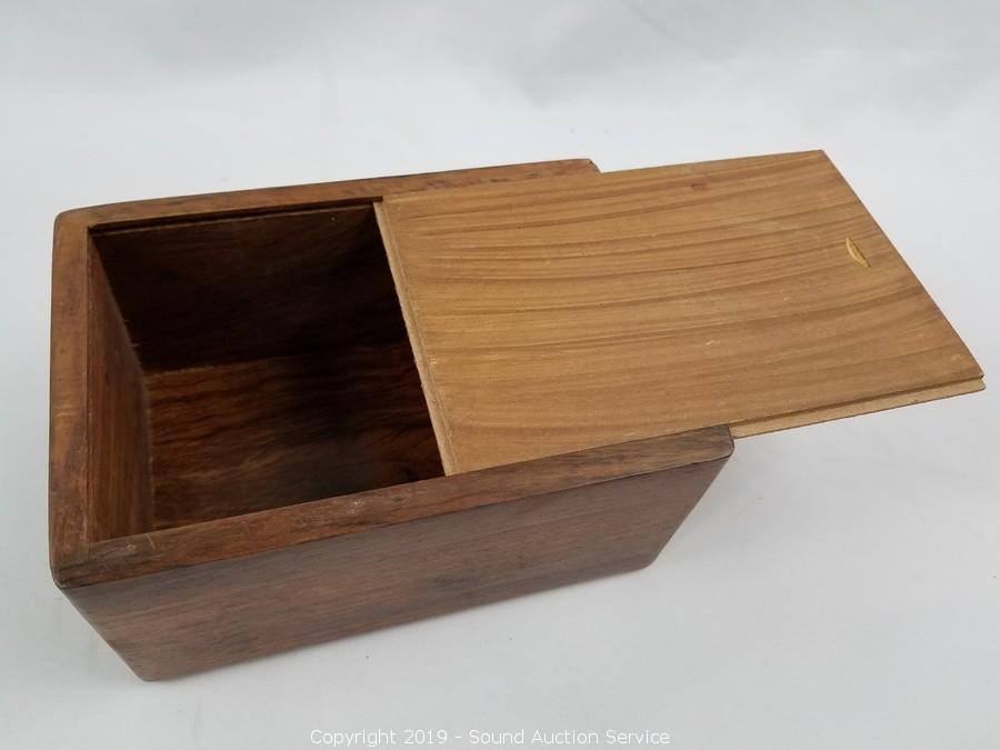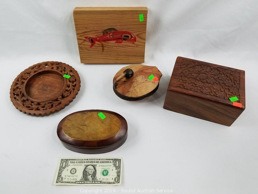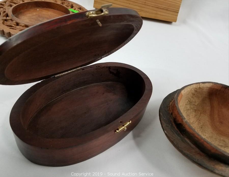 Lot #0339: 4 Wooden Trinket Boxes & Candle Holder