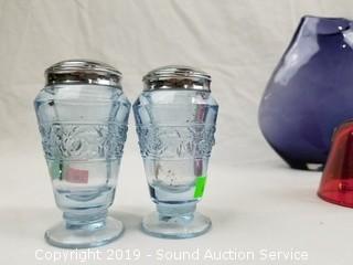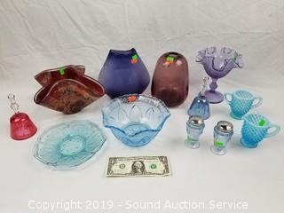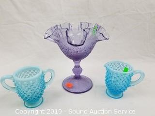 Item Description: Blue Fenton like Hobnail cream sugar, art glass Vases, Compote, Candy Dishes & Bells.