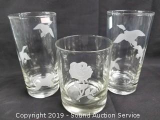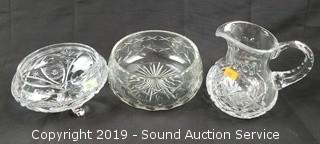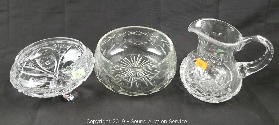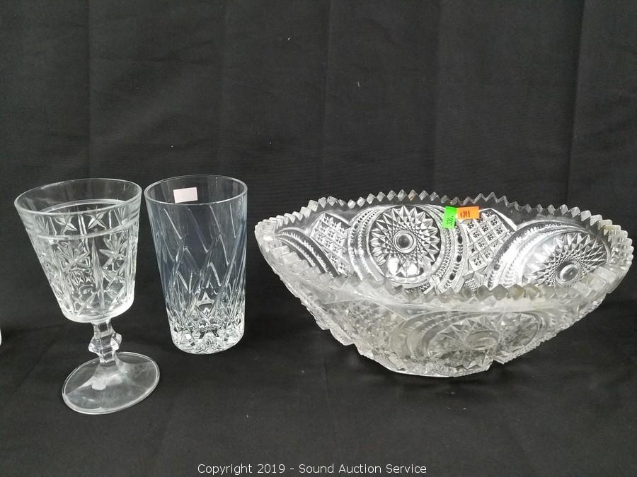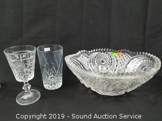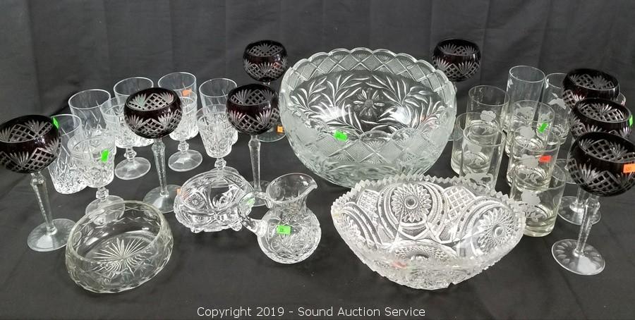 Item Description: Includes large depression glass bowls, crystal pitcher, footed and non-footed dish, 4 crystal goblets, 5 crystal tumblers, rose and duck print high ball and tumbler glasses and 8 cut crystal ruby flash wine glasses.