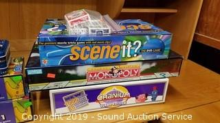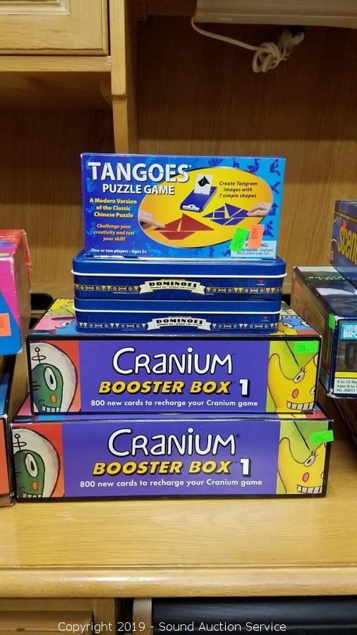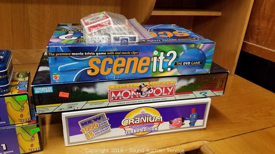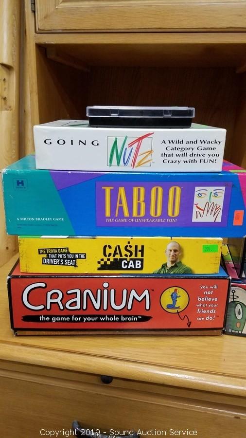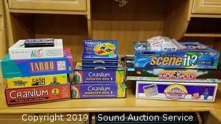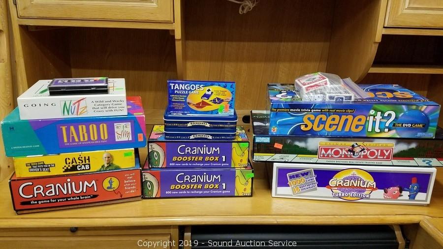 Item Description: Dominos, dice, playing cards, Scene It?, Monopoly, Cranium, Tangoes puzzle game, Going Nuts, Cranium booster boxes, Cash Cab and Taboo.