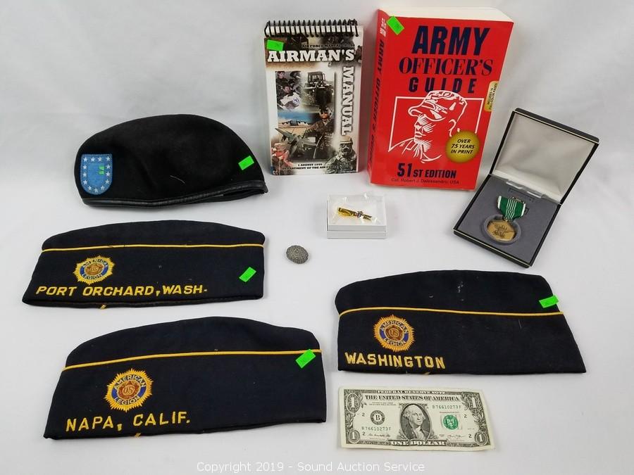 Item Description: Includes Army Men's manual, Army Officer's guide, Military merit medal, K of C tie clip, American Legion hats and beret.