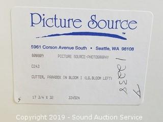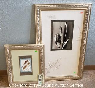 Item Description: One is by 'Cutter' titled "Paradox in Bloom I" 17.75" x 32", other is by 'Butler' titled "Mini Larkspur" 44/375, 12" x 16".
