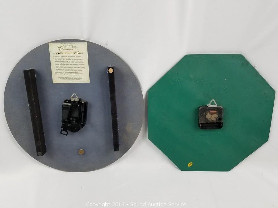 Item Description: Quartz movement. Tin Plate Toy Company clock is missing the pendulum. Approx. 13" diameter.