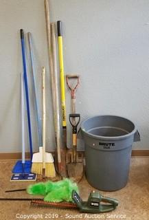 Lot #0235: Trash Can w/ Various Yard & Household Tools