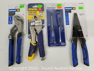 Item Description: Irwin 7" vise grips, Kobalt 8.5" wire strippers, 8" groove joint pliers, and 2pc. pocket screwdriver set.