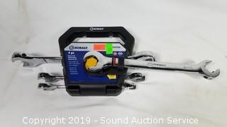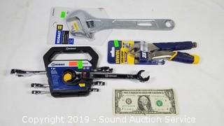 Item Description: Kobalt 12" adjustable wrench, Irwin 7" vise grip, and Kobalt 4pc. open end ratcheting wrench set SAE 3/8" to 3/4".