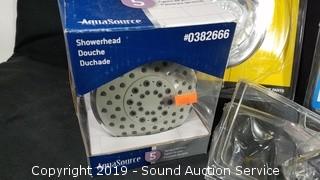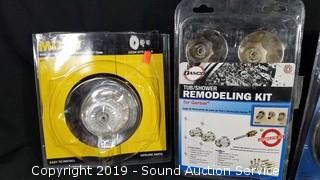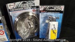 Item Description: Tub and shower remodeling kit, tub spouts, shower heads, temperature control handles, and more. Unknown conditions and completeness.