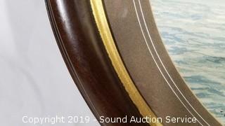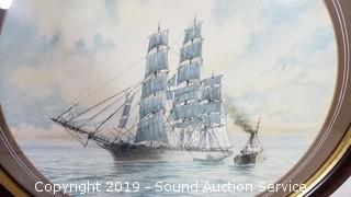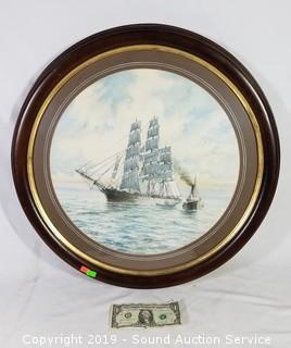 Item Description: Chris Williams (1873-1934). Cutty Sark in full sail, becalmed, with steam boat. 23-1/2" diameter framed image. Condition: Excellent.