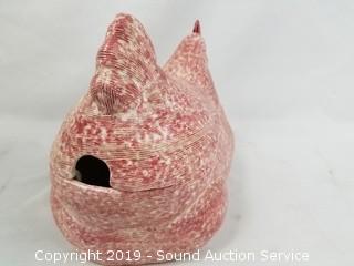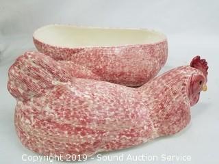 Item Description: Figures are a matching pair, approx. 19" H, in excellent condition. Soup tureen is red speckled hen with cover, 10" ceramic container and lid, in good condition, has a black mark on the bottom.