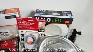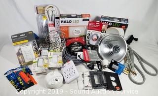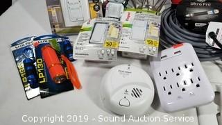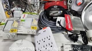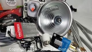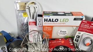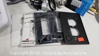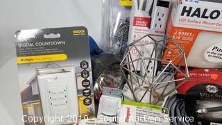 Item Description: Utility light, coax cable, swag light kit, power strip, USB outlet, timer, slide dimmer switches, flashlight, switch plate, and more.