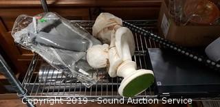 Item Description: Includes towels, glassware, Crystal Goblets, Flutes & Jack Daniels Glasses, Sony BDP-BX2 Blu-ray Player (no remote or power cord), GE Space Master Over Range Microwave (Microwave, vent and light all work. Handle for the door has broken off, needs repaired. Approx. 16" T x 30" W x 15" D.), Tiles, Flooring, Chimney, Donjoy Arm Sling & Pillow - Medium