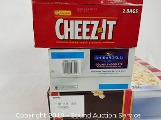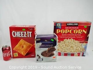 Item Description: Includes 24oz bag of Cheez-It baked snack crackers best by March 18, 2019 (expired), 14pk Ghirardelli double chocolate brownie mug mix best by March 18, 2020 and 42ct Kirkland Movie Theater Butter Popcorn best by September 12, 2019.