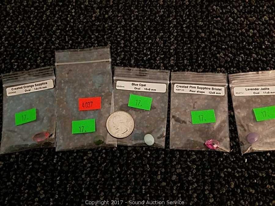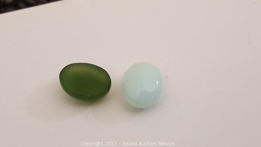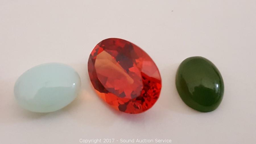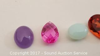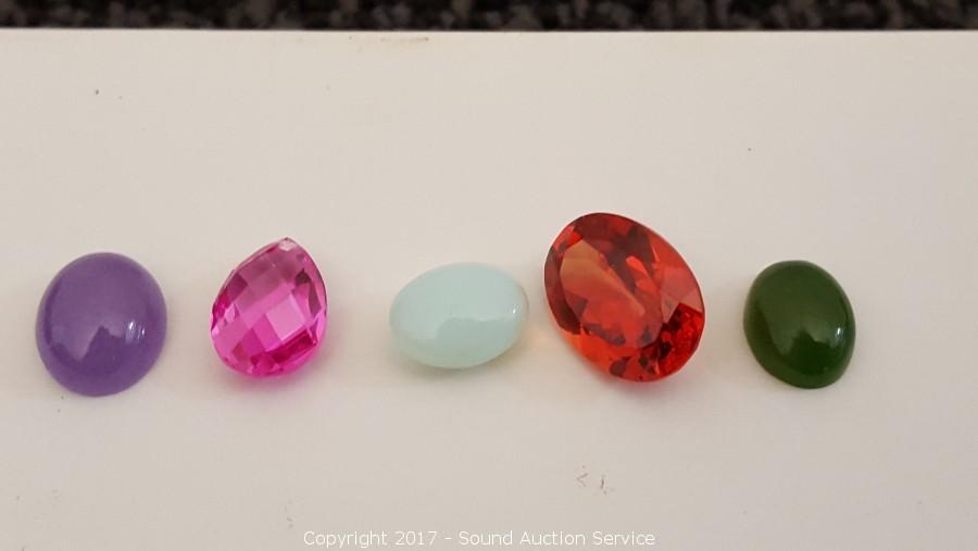 Ready to be placed in jewelry. Includes Created Orange Sapphire 14x10mm Oval Cut, Created Pink Sapphire Briolette Pear Shaped Cut 12x8mm, Lavender Jadeite Oval Shaped 11x9mm, Blue Opal Oval Shaped 10x8mm, Jade Oval Shaped 6x8mm.