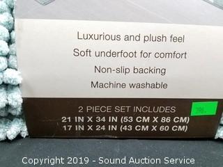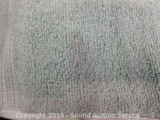 Item Description: 17" x 24" & 21" x 34" Butter noodle bath rugs, 2 Charisma hand towels (both have minor stains) & 4 tie on chair pads, mint green.