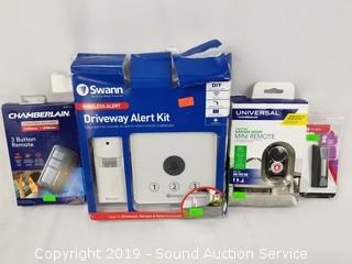 Item Description: Chamberlain 3 button remote, 2 button garage door mini remote, Swan wireless alert driveway kit & Utilitech wired button. All are like new.