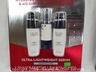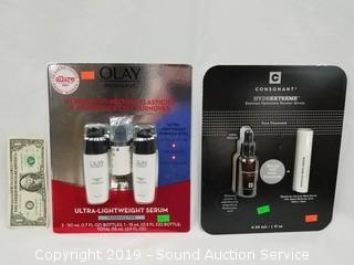 Item Description: Consonant hydration booster serum, factory sealed. Olay Regenerist ultra light weight serum. (2) 1.7" & 1/2oz bottles. One of the larger bottles is half full.
