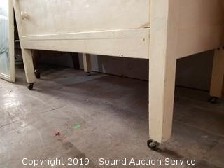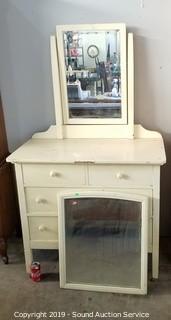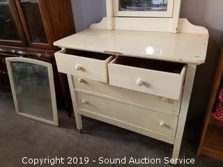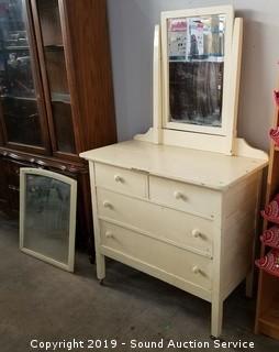 Item Description: Also comes with a 22" x 27" mirror. Dresser is on casters, painted ivory, some wear to the finish. Overall approx. 65" H, 38" W, 19" D.
