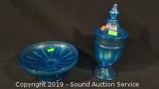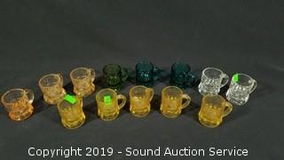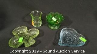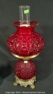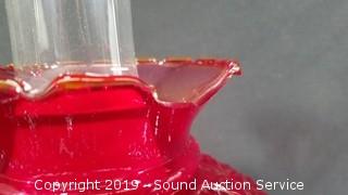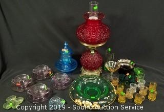 Lot #0117: 32pc Ruby Oil Lamp, Vaseline & Colorful Art Glass Dishes