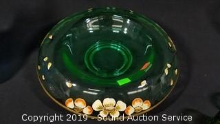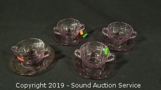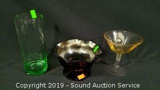 Item Description: Includes 4 teacups with saucers, vintage ruby glass oil lamp (shade has a large chip), painted glass console bowl, 13 shot glasses, 2 small dishes, tall drinking glass, martini glass, shallow dish, 3 ruffled edge dishes and a candy dish.