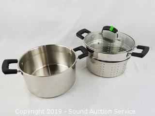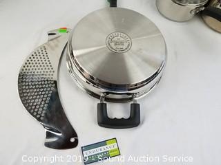 Item Description: Edge strainer, stock pot with steamer insert and lid, 2 sauce pans with lids, and 10" skillet.