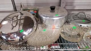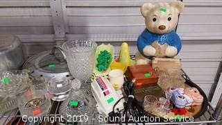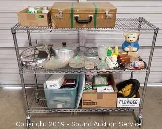 Item Description: Cart NOT included. Includes trinkets, Christmas ornaments, vacuum hair cutter, teddy bear cookie jar, picnic set, salt and pepper shakers, various glass dishes, stainless cookware, picture frames and more.