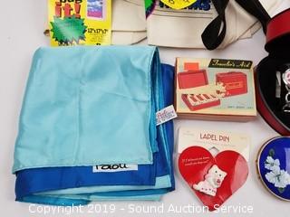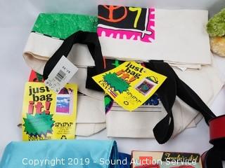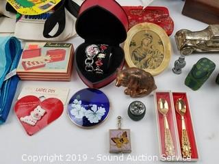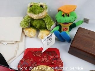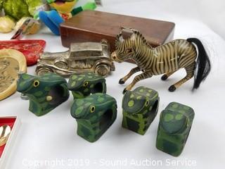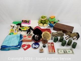 Item Description: Includes Betty Boop watch with case, wooden frog napkin holders, King Tut gold tone spoon, Earth tote bags and more.