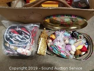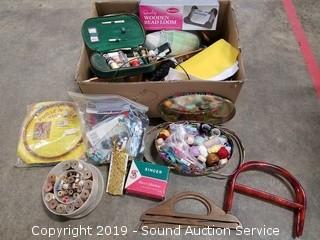 Item Description: Includes ribbon, thread, purse handles, sewing needles, zippers and more.