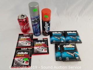 Item Description: 2 bottles of shave cream, (3) 10-packs Gillette Trac II plus cartridges, and (4) 10-packs Gillette Sensor cartridges.
