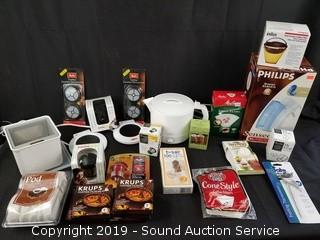 Item Description: Phillips water reservoir, Krups coffee filters, K-cup filters, tea bag buddies, hot plates, pod filters, cone filters, and more.
