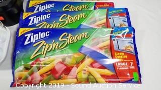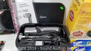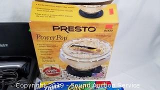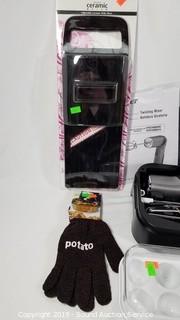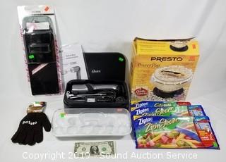 Item Description: Oster hand mixer, ceramic wide slicer, potato scrubber gloves, 3 packages of 7 Ziploc steam bags, raw or boiled egg container & Presto power popper.