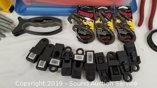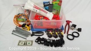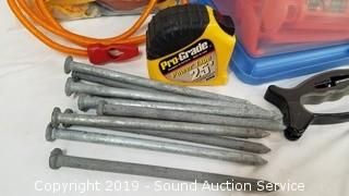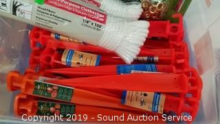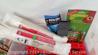 Item Description: A couple lengths of 10ft x 1/4" rope, lawn stakes, galvanized nails, grommet kit, heavy duty rubber bands, and more. Tote included, 16 quart, 16" x 11" x 7".