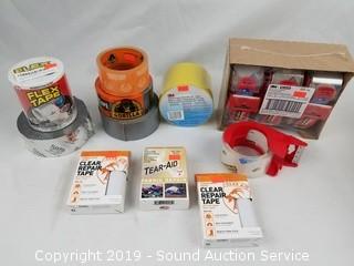 Item Description: Includes Flex Tape, Gorilla tape, duct tape, general purpose vinyl tape, Scotch shipping tape, Flex Fix, clear repair tape and Tear Aid fabric repair tape.