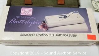 Item Description: Includes 6 vintage grooming/shaving kits with leather cases and One Touch Deluxe Home hair removing kit.