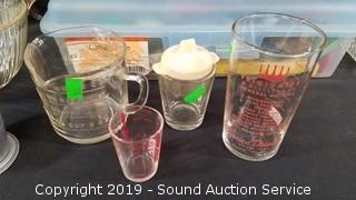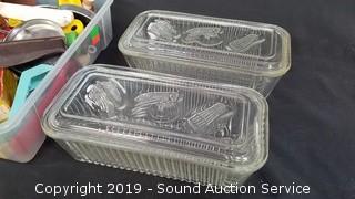 Item Description: Glass refrigerator dishes, unique honey pot, measuring cups, covered dish, bowls, and various utensils.