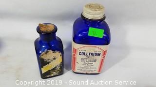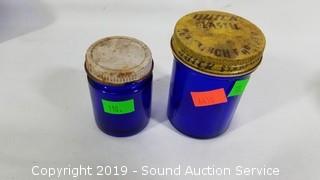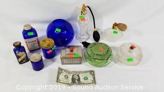 Item Description: Includes cobalt blue glass vials and dish, vintage powder dishes and perfume spray bottles and vaseline glass? powder dish.