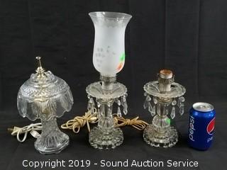 Item Description: 2 of the lamps have acrylic bases and crystal? prisms. One is missing the chimney. Approx 14" and 9" tall. Other lamp is crystal, approx. 11" tall.