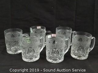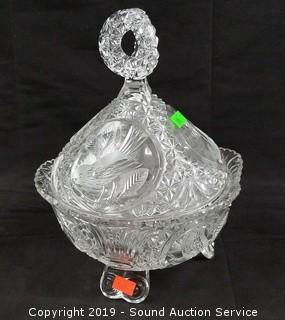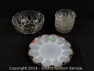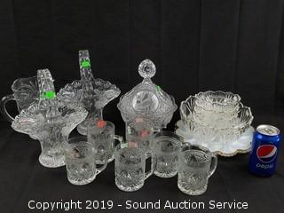Item Description: Includes 6 pressed glass handled cups, (2) 10.5" crystal etched handled baskets, 7" crystal pitcher, 9.5" crystal covered dish, (4) 5" crystal bowls with gold rims, 9" crystal bowl with gold rim and gold edge milk glass oyster dish.