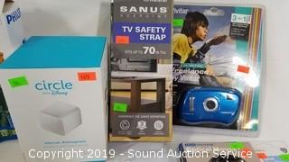 Item Description: Includes 4GB USB drive, USB Hub Man, Optical Mouse, Vivatar 3-in-1 digital camera, TV Safety Strap, Circle with Disney, Digital Alarm Clock and String Lights.