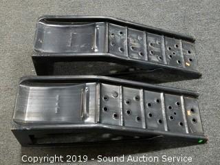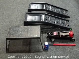 Lot #0041: Pair of Metal Vehicle Ramps, Stool & 2Ton Car Jack