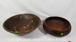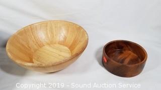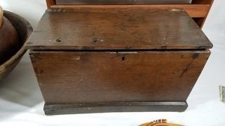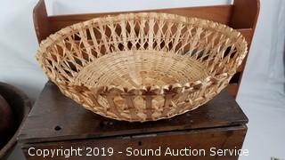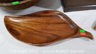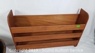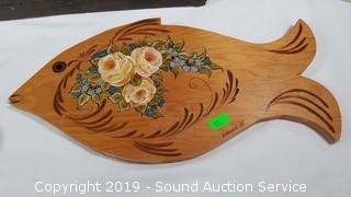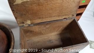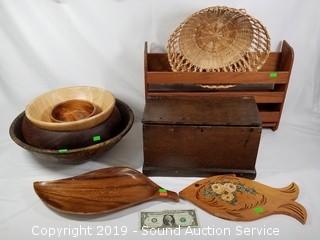 Item Description: Old wooden box, burl wood center bowl, salad and bread bows, magazine rack, A/S "Lynne" fish wall decor, and more.