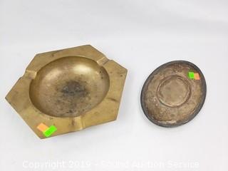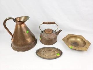 Lot #0110: Vtg. Copper Pitcher, Teapot, Brass Ashtray & Dish