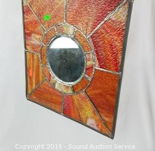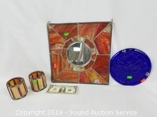 Item Description: 12" square stained glass mirror, 2 stained glass candle holders, and Blenko hand made "Cancer" wall art.