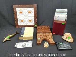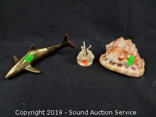 Item Description: Conch Sea Shell, Porcelain Trivet, Hidden Stash Book (pages have been hollowed out for hiding), Brass Shark, Carved Stand.