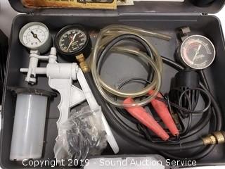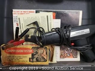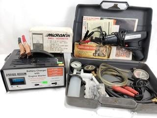 Item Description: Includes Compression tester, Dwell Tachometer, timing light, fuel pump tester with case. Battery charger is Chicago Electric 6v/12v battery charger with engine starter.
