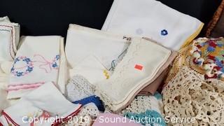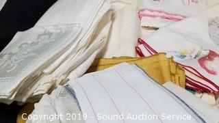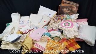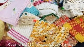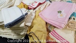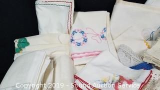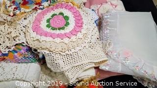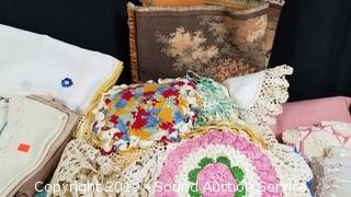Item Description: Includes embroidered pillow cases, knitted apron, vintage tapestry, crochet doilies, 58" x 80" floral table cloth, 56" x 80" crochet table cloth, 54" x 62" crochet table cloth, embroidered napkins and more.