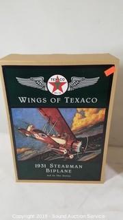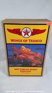 Item Description: 1931 Stearman Biplane, and 1929 Curtiss Robin Airplane. Both are by Ertl Collectibles. Dated 1995 and 1998. Both appear to be NIB. Banner is Texaco 5" limited edition airplane bank, vinyl, 12" x 36".
